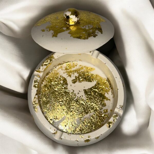 Un cendrier d’exception, à la fois pratique et raffiné. Blanc Prestige se distingue par son allure chic, mariant le blanc pur à de délicates feuilles d’or — ou d’argent selon vos envies. Fabriqué en jasmonite, il allie solidité et élégance, parfait pour sublimer une table ou un coin fumeur avec goût.
