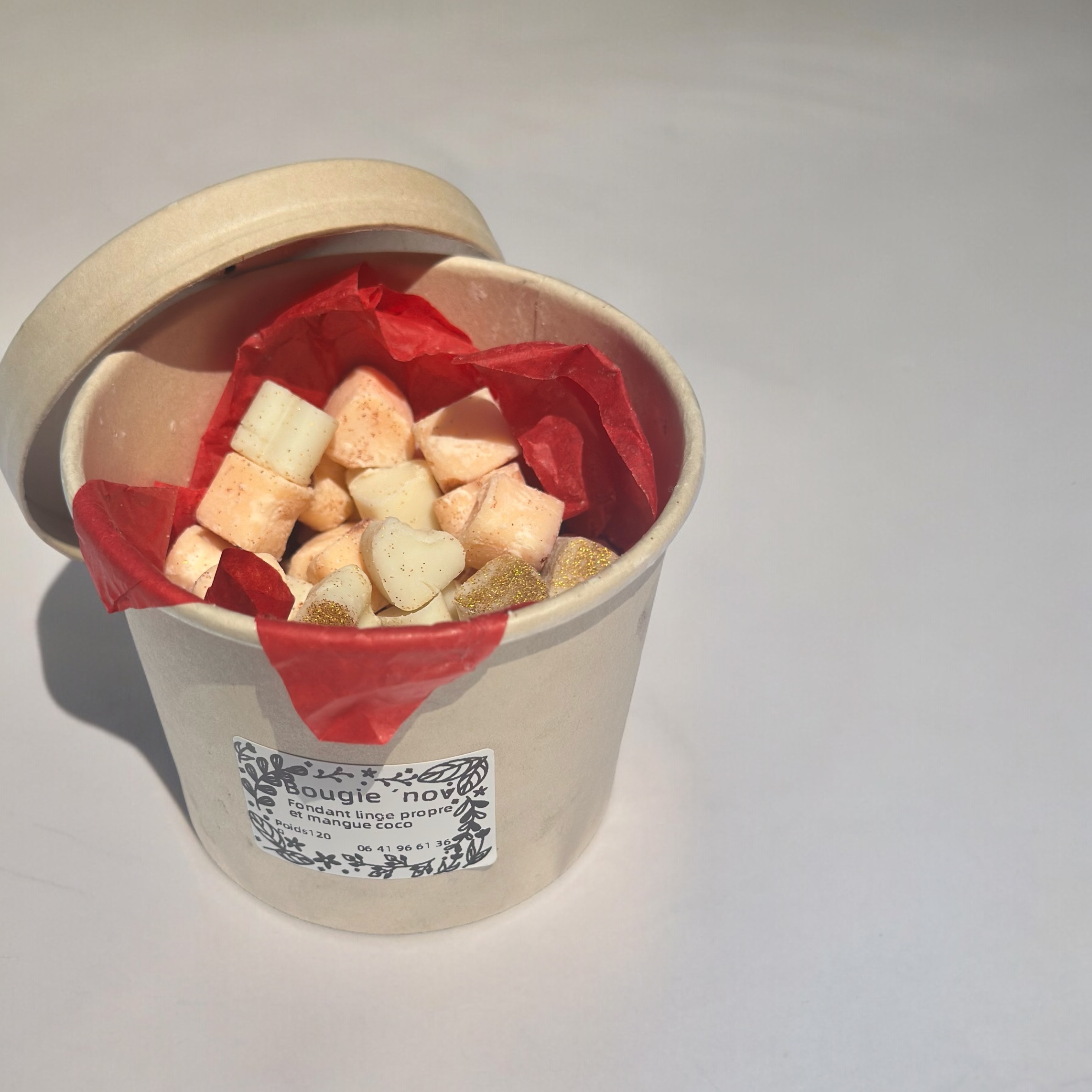 Offrez une parenthèse de douceur avec ces fondants parfumés en forme de cœur, fabriqués à la main à partir de cire de soja 100 % naturelle, respectueuse de l’environnement et sans substances toxiques. Chaque pot en kraft contient environ 100 grammes de fondants colorés, à faire fondre dans un brûleur pour libérer leur parfum délicat dans toute la pièce.