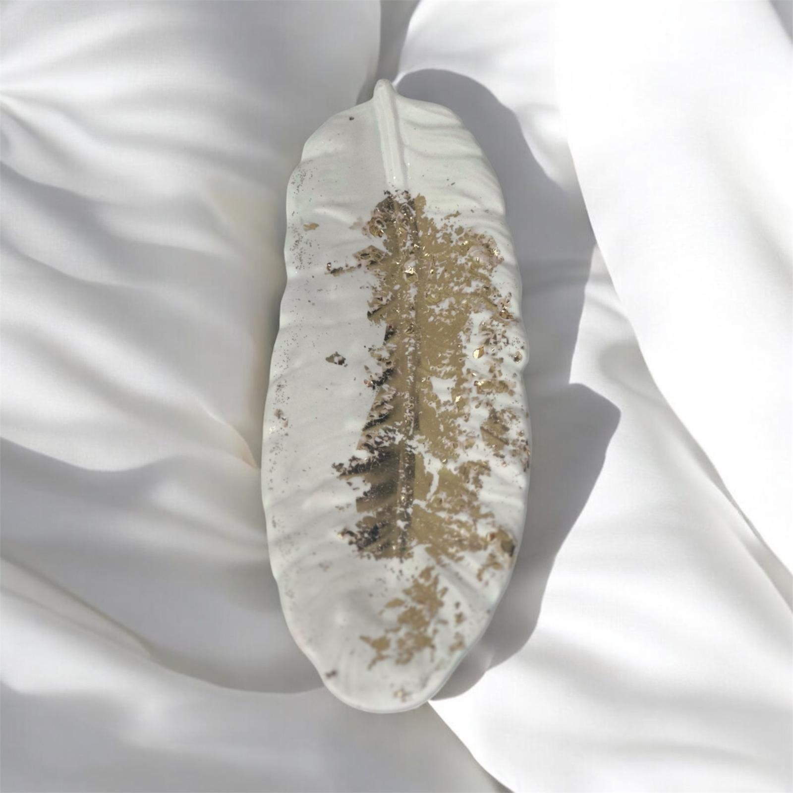 Craquez pour cette petite assiette en forme de feuille, légère (0,180g) et pleine de charme, fabriquée à la main en jesmonite blanche.