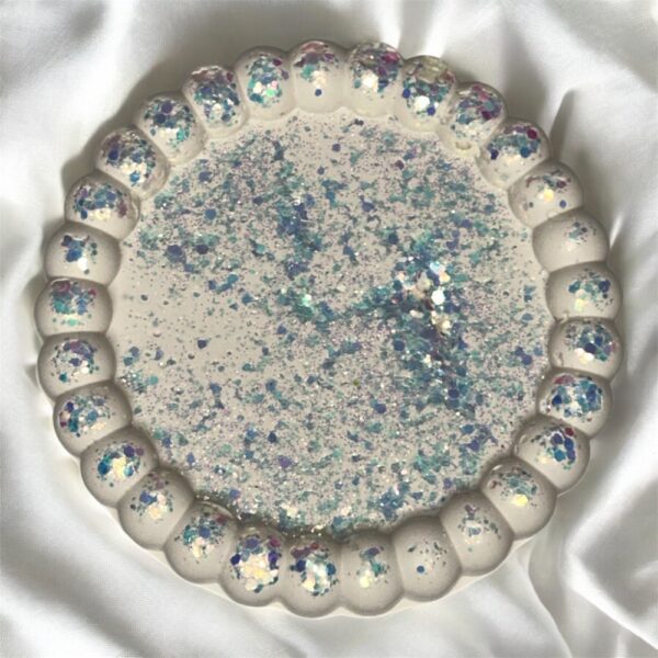 Pétale Scintillant est une petite assiette artisanale en jesmonite, délicatement rehaussée de paillettes biodégradables pour un effet lumineux et raffiné.