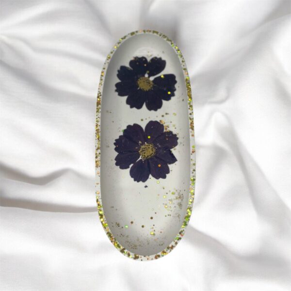 Chaque plateau est coulé à la main en matière jesmonite, dans un coloris blanc raffiné, puis délicatement orné de fleurs séchées naturelles (multicolores ou grandes fleurs violettes), de paillettes scintillantes (or, argent, bleu, rose ou rouge) et de véritables feuilles d’or ou d’argent.