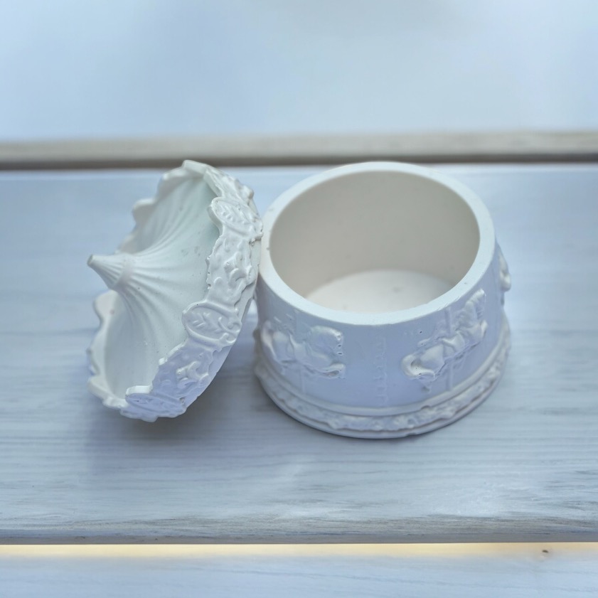 Inspirée de l’univers poétique des carrousels d’antan, cette pièce en jesmonite dévoile une délicate tour ornée de petites chevales en relief, comme figées dans un doux souvenir d’enfance. À la fois pot, vide-poche ou objet décoratif, elle accueille sucre, bijoux, bagues ou petits trésors dorés avec grâce. Pesant 0,510 grammes et proposée au prix de 22€, elle trouve sa place sur une table, une étagère ou dans un écrin de cadeau. Chaque pièce est entièrement réalisée à la main, avec soin et amour. Déclinée en plusieurs variations — blanc pur, blanc doré, blanc noir, noir profond, ou enrichie de feuilles d’or, d’argent ou de paillettes, elle s’adapte à tous les univers, du plus minimaliste au plus féerique. Une création artisanale qui invite au rêve et à la douceur.