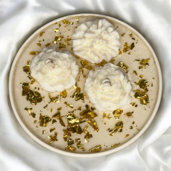 Coulée à la main avec une base de cire de soja naturelle, elle se distingue par sa couche de gel de paraffine parsemée de feuilles d’or véritables, qui captent la lumière et révèlent toute la beauté de la flamme.